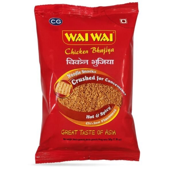 WAI WAI Snacks Bhujia 50 g is a crunchy snack made by crushing Wai Wai instant noodles and seasoning them with a spicy chicken flavor. It delivers a savory, umami taste with a satisfying crisp texture. The 50 g pack is perfect for quick snacking on the go.
