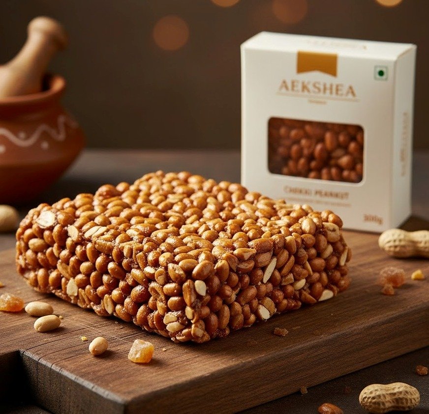 Aekshea Chikki Crusted Peanut 300g, crunchy peanut brittle snack, lightly sweet and perfect for festivals or casual snacking.