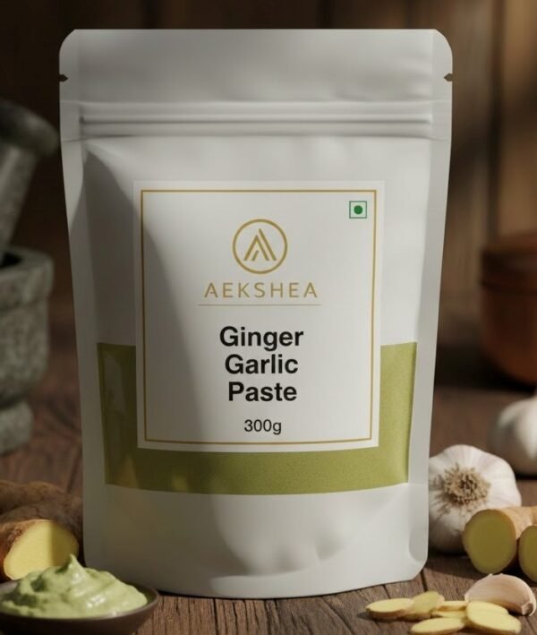Aekshea Ginger Garlic Paste 300g, ready-to-use aromatic paste. Ideal for curries, gravies, marinades, and quick meal preparation.