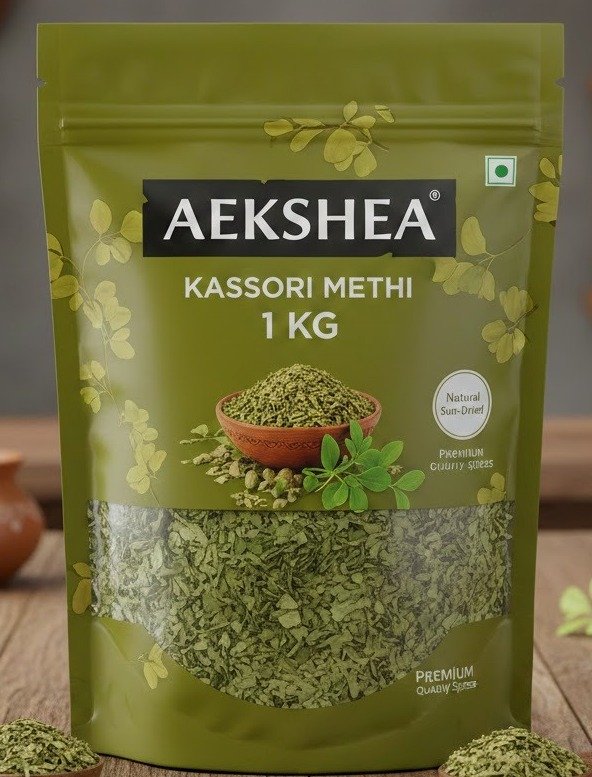 Aekshea Kassori Methi 1 Kg, dried fenugreek leaves. Aromatic and flavorful, ideal for curries, parathas, and seasoning Indian dishes.