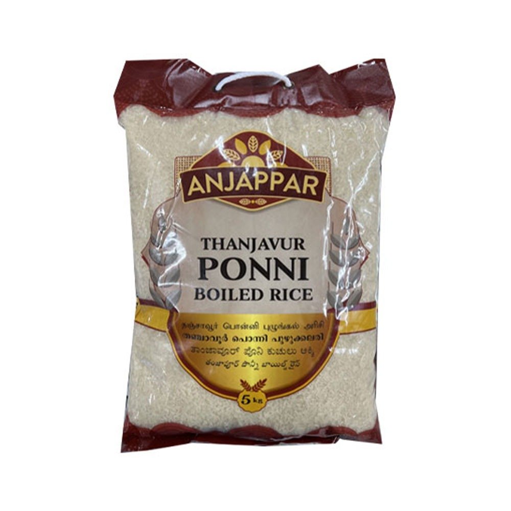 ANJAPPAR Ponni Boiled Rice 5KG, high-quality rice suitable for daily meals, biryani, and steaming.