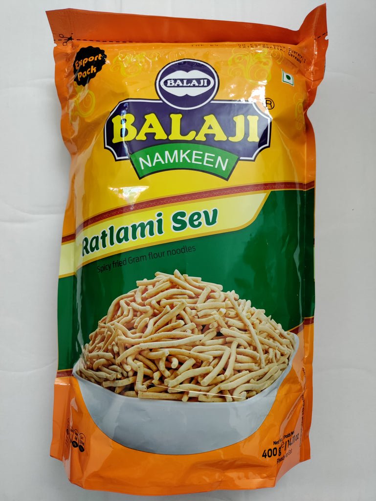 Balaji Ratlami Sev 400G ? Crunchy and spicy Ratlami sev snack made from gram flour. Perfect for munching, tea time, or gifting, with authentic Indian street-style flavor.