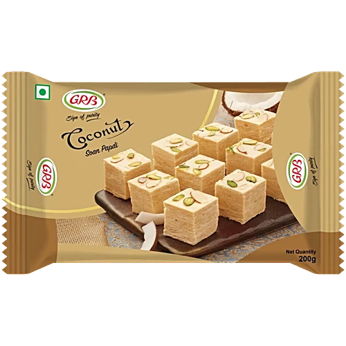 GRB Coconut Soan Papdi 200G ? Traditional Indian sweet made with coconut, sugar, and milk. Soft, flaky texture ideal for festivals or gifting.