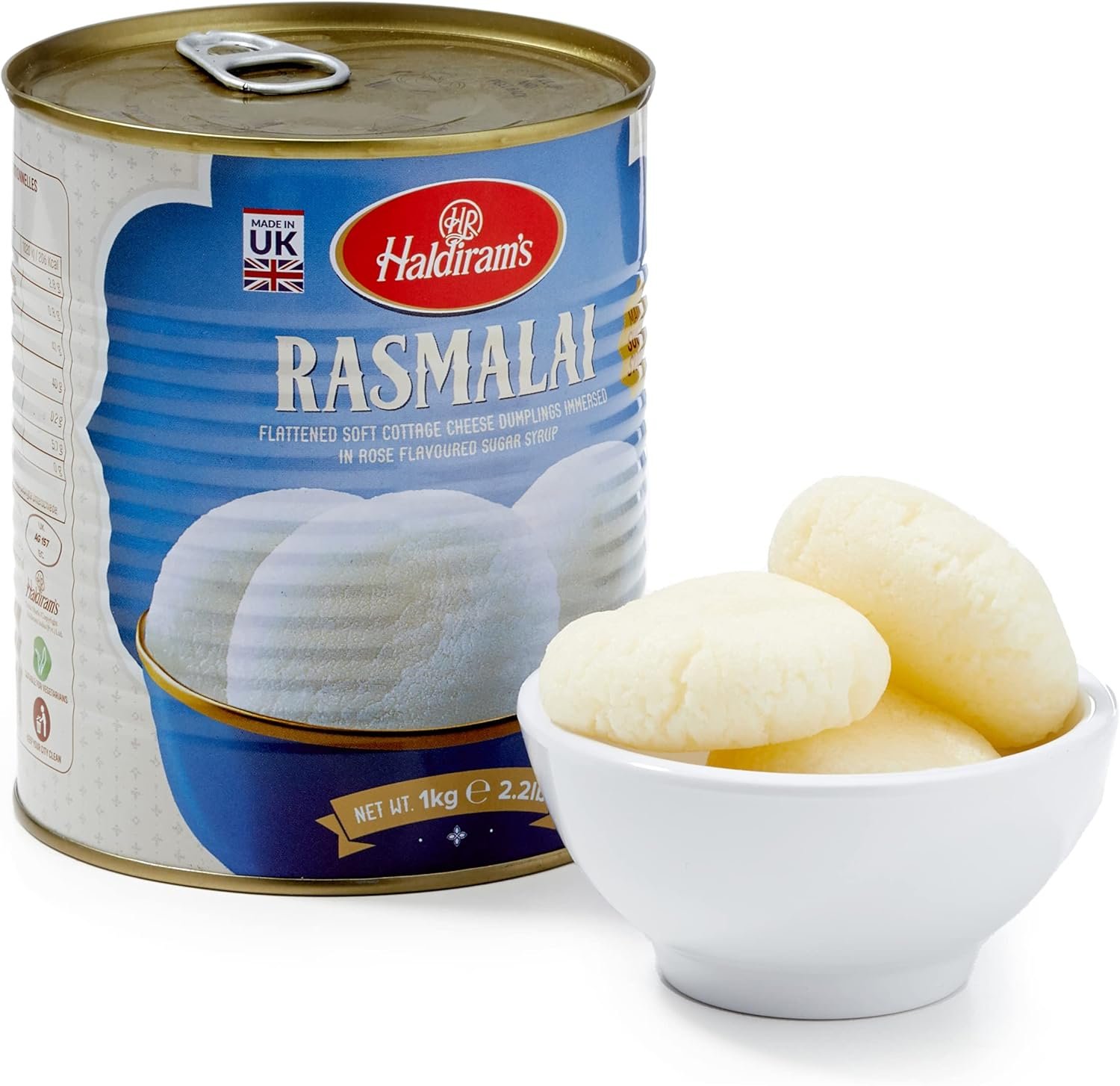 Haldiram Rasmalai 1 Kg, traditional Indian sweet soaked in creamy syrup.