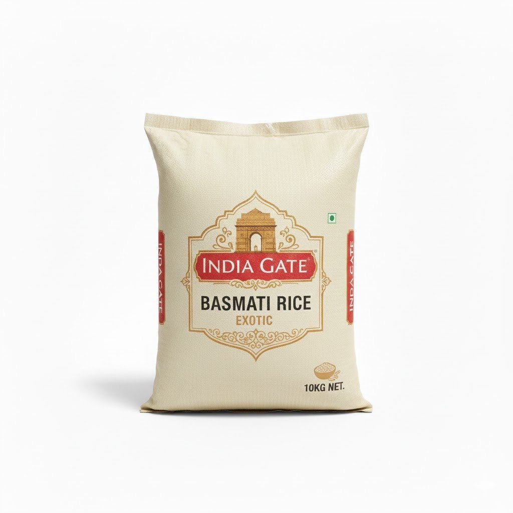 India Gate Basmati Rice Exotic 10KG ? Premium long-grain aromatic rice for special occasions and festive meals. Ideal for biryanis, pulaos, and family feasts with rich fragrance and soft texture.