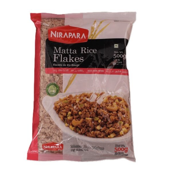 Nirapara Matta Rice Flakes (Red) 500g, flattened red rice flakes for South Indian dishes.