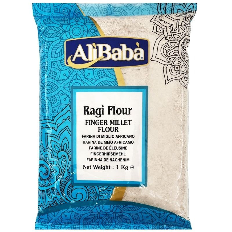 Ragi Flour Ali Baba 1 Kg, nutritious whole grain flour. Ideal for making rotis, porridge, or healthy baked items.