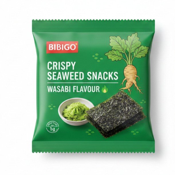 Seaweed Snacks Wasabi Flavour 5g, crunchy seaweed snack with wasabi flavor.