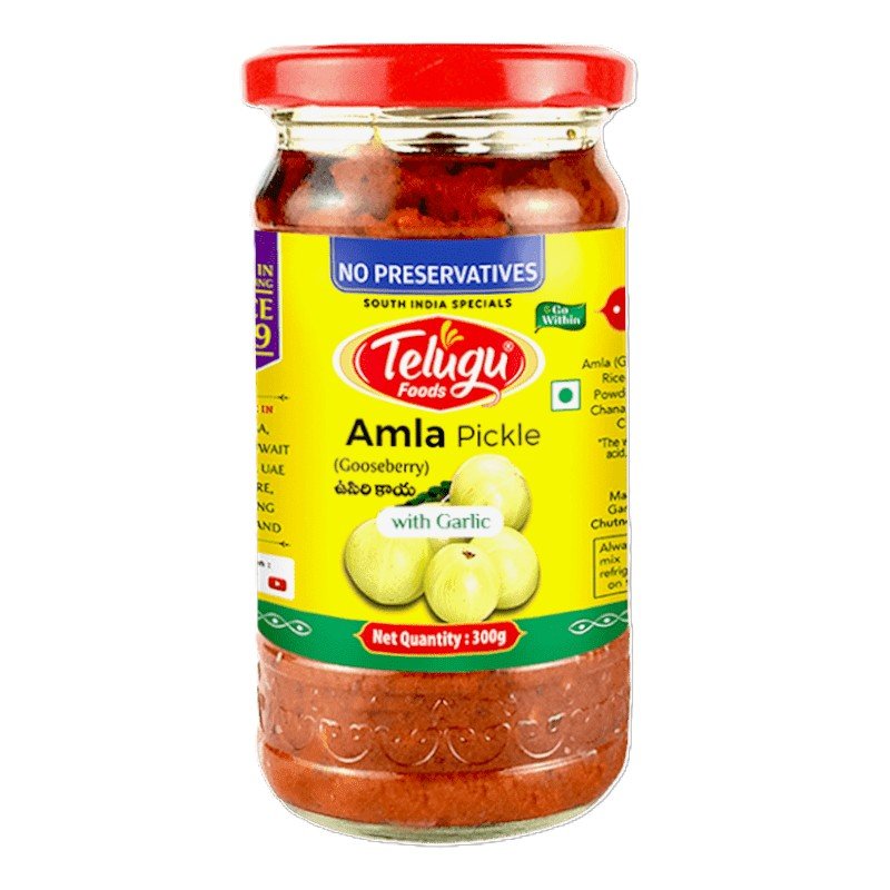 Telugu Pickle Amla Garlic 300G ? Pickled Indian gooseberries (amla) with garlic. Tangy, healthy, and flavorful accompaniment to meals.